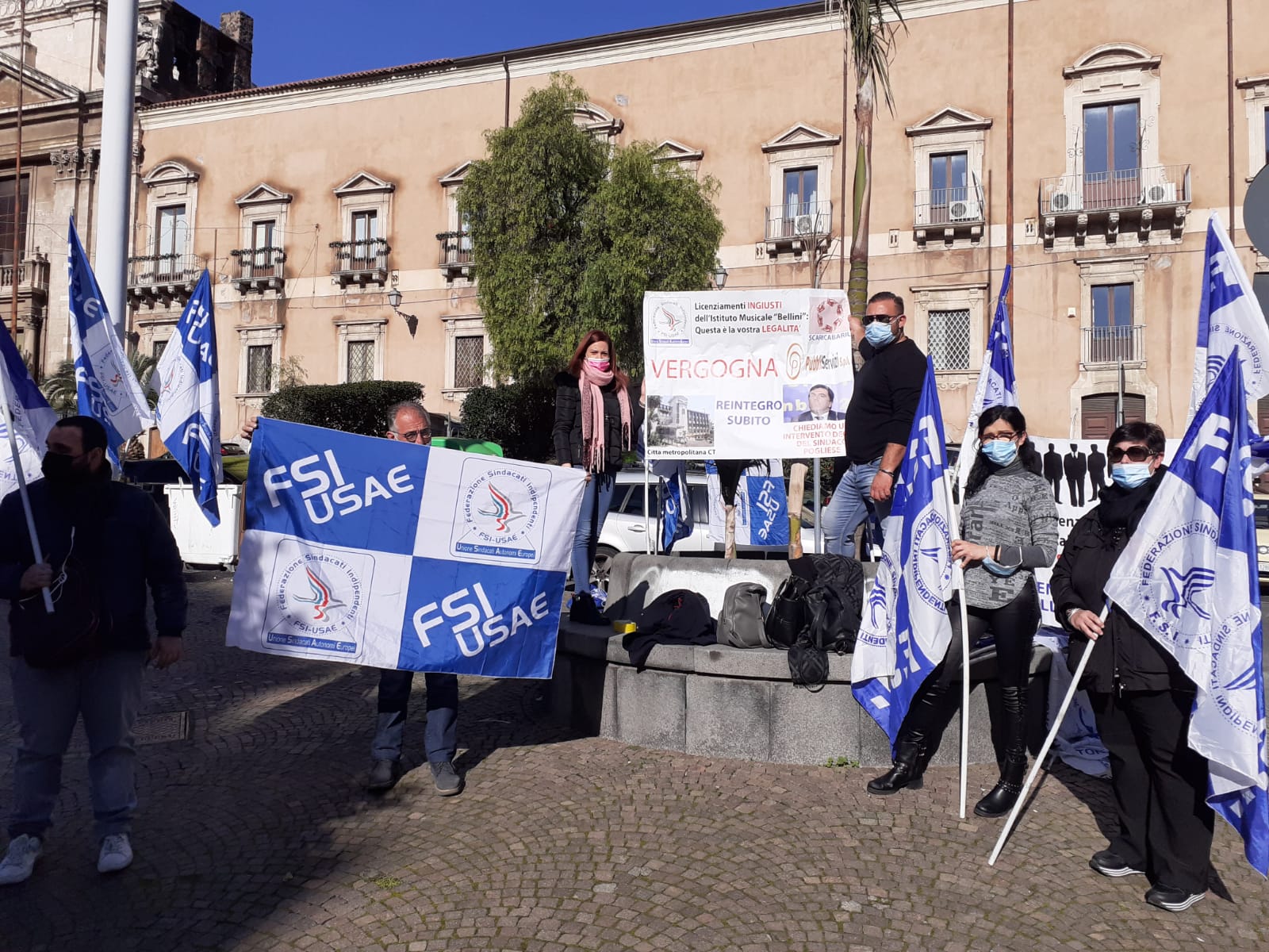 Si è svolto stamattina un sit-in di protesta in piazza San Domenico a Catania, organizzato dalla Fsi-Usae Federazione Sindacati Indipendenti organizzazione costituente della confederazione Unione Sindacati Autonomi Europei, per porre l’attenzione sul mancato reintegro di 8 lavoratori custodi dell’Istituto musicale “V.Bellini”.