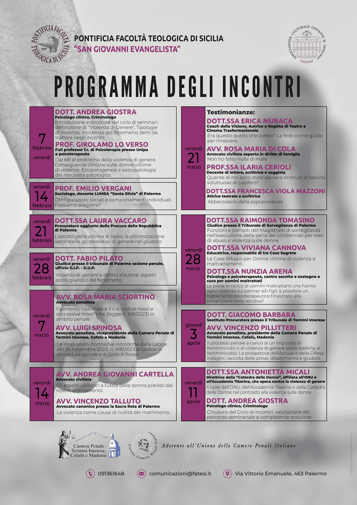 Il Ciclo di Seminari sarà aperto dal Preside, Prof. don Vito Impellizzeri, e verrà diretto e coordinato dal Dott. Andrea Giostra, direttore dell’Ufficio sviluppo e progettazione della Pontificia Facoltà Teologica di Sicilia e delle Case Salesiane di Palermo, psicologo, criminologo, ideatore e coautore, insieme ad altri 19 professionisti, del Saggio “Femminicidio e Narcisismo Patologico: quale correlazione e come prevenire relazioni pericolose” che sta riscuotendo interesse e successo in tutta Italia con diversi riconoscimenti da parte di enti pubblici e organizzazioni private che lavorano a tutela delle Donne.